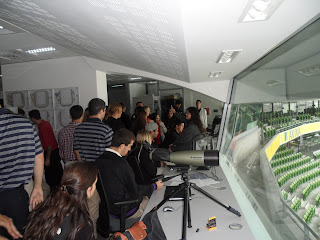 Our next stop brought us into the press box, or television station area where we could see where they actually film the games. Here the roof and the walls were protected in a sound proofing material so the crowd is silenced significantly during production.
